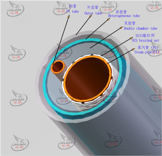 3) 內(nèi)層使用PI管表面不銹鋼編織網(wǎng)?包覆,確保高溫蒸汽(約?103℃?)在輸送過程中無泄漏?,確保導(dǎo)管內(nèi)部溫度波動(dòng)穩(wěn)定,可有效防止熱損傷擴(kuò)散。